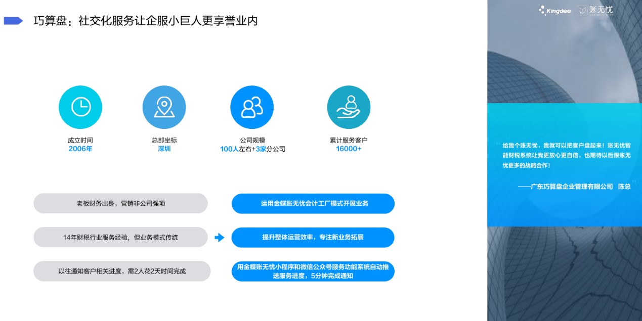 l 采用传统软件做账,员工容易出错、导致返工,无形中增加了工作量;员工人均负责客户数量多,业务效率低下,经常加班,离职率高。