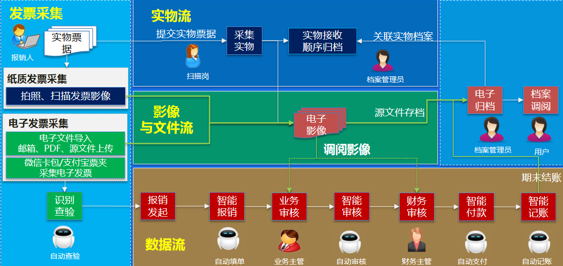 2、归档手工整理,任务繁重。员工需要将电子发票打印连同审批单交于财务,财务人员匹配相应的凭证单进行整理归档,财务人员归档时面临诸多困难,比如发票结构化数据提取困难,实物分散;不断重复进行档案录入的操作,耗时费力。每月整理匹配单据需要3个工作日。