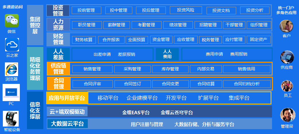 金蝶为川投集团设计的信息化解决方案的核心是为川投集团建立集团化管控平台,借助于多组织、多法人体系的信息化的管理软件来进行管理和支撑,从而达到加强集团管控,数据集中管理,降低运营成本,提高工作效率的管理目的。