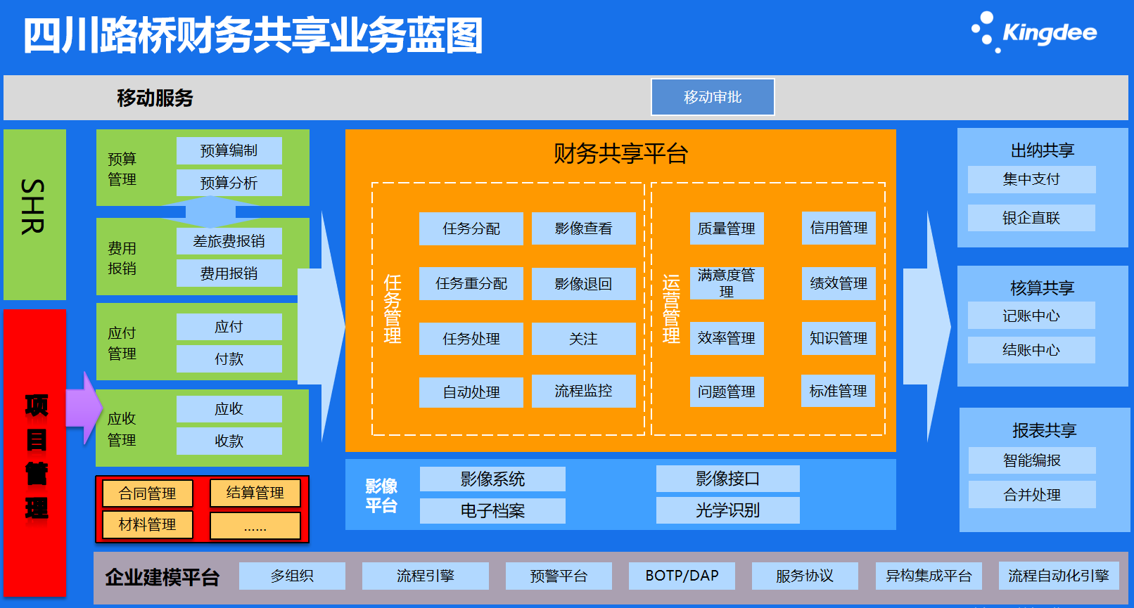 四川路桥财务共享业务蓝图采用成熟平台+二次开发模式,通过s-HR系统和项目管理系统链接财务共享平台并协同影像平台链接出纳共享、核算共享和报表共享,实现集团财务处理的标准化、规范化、一体化。