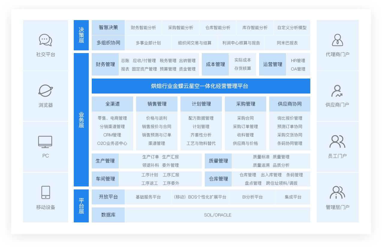 为烘焙企业提供一体化平台,覆盖企业全面业务,包含财务管理、采购管理、销售管理、库存管理、生产管理、研发管理、渠道管理等,在PaaS平台的支撑下,企业可以灵活地定义自己的业务,平台即业务,全面支撑烘焙企业内外部价值链重构,加快产品、渠道、服务的转型升级。