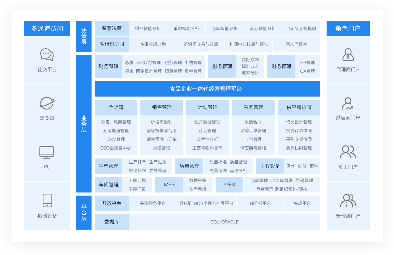 通过门户快速连接用户、伙伴、供应商,通过管理服务化,业务移动化,分析数据化,决策智能化,不断对企业的供应、生产、销售等环节进行降本增效,进而形成食品企业的核心竞争力