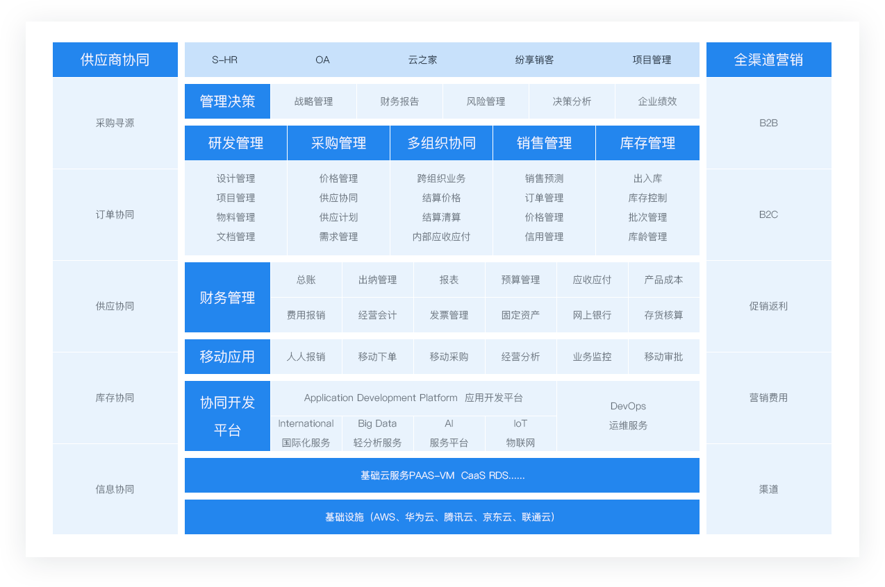 通过PaaS+SaaS,这样的高生产力连续体,助力企业商业模式创新。多组织协同、集团管控,帮助服务型企业实现集团化发展,统一管控;供应商协同与全渠道分销加强了与产业链上下游的密切协作,提升企业的核心竞争力;业财税一体化,通过更精准高效的核算,更睿智的洞察,帮助企业实现战略目标。