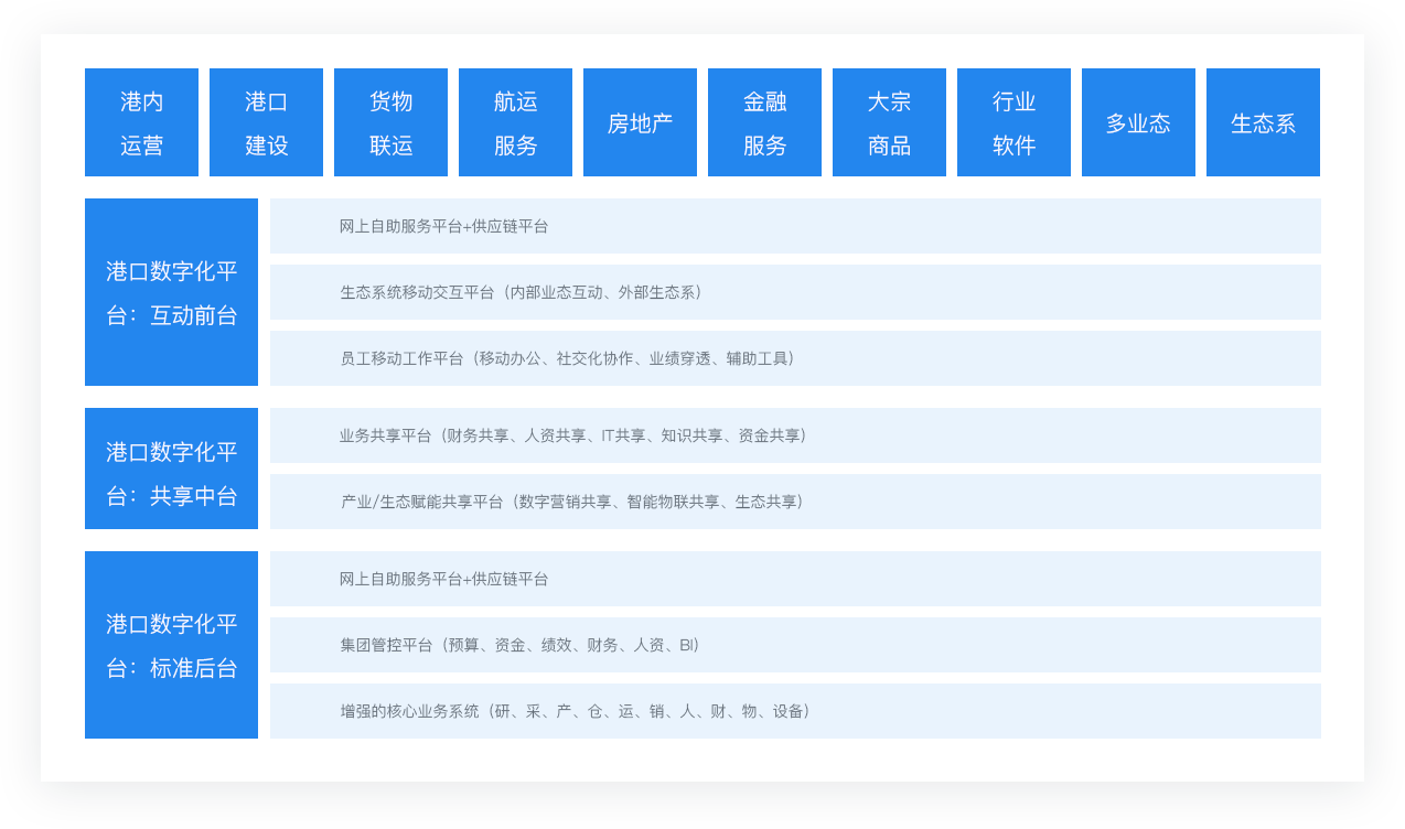 以苍穹平台为依托,融合门户、财务管理、资金管理、预算管理、供应链管理、人力资源管理等诸多管理系统,原生开发港口生产作业和调度系统,构建智慧港口中台,助力港口物流数字化转型