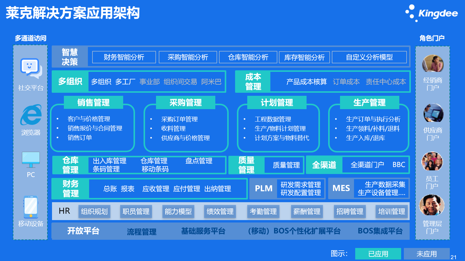单体平台,支撑弱:随着业务快速发展,莱克相继在武汉、山东等地开设工厂,K3单体平台,致使莱克需要部署多套K3系统,管理和维护成本高,并且不能满足莱克集团化发展产生的对业务、财务的统一管控需求。
